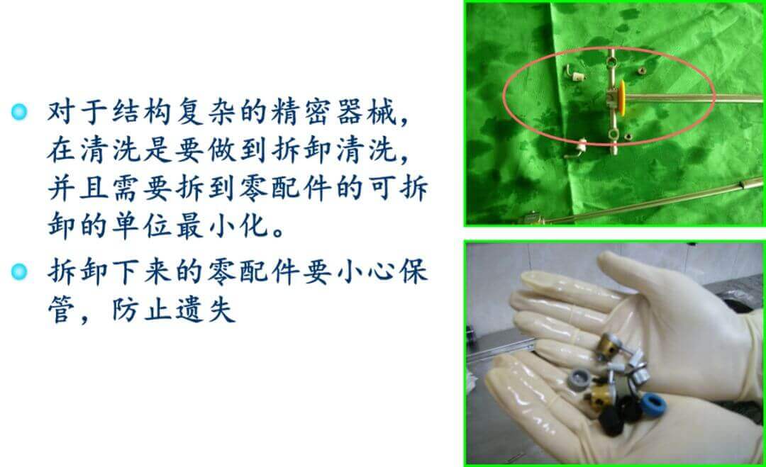 機器清洗并不能全部代替手工清洗,對于某些管道、精密儀器和較難清洗部位必須手工清洗,此外對于清洗設備必須經常清洗和保養(yǎng)以免機器清洗失效。